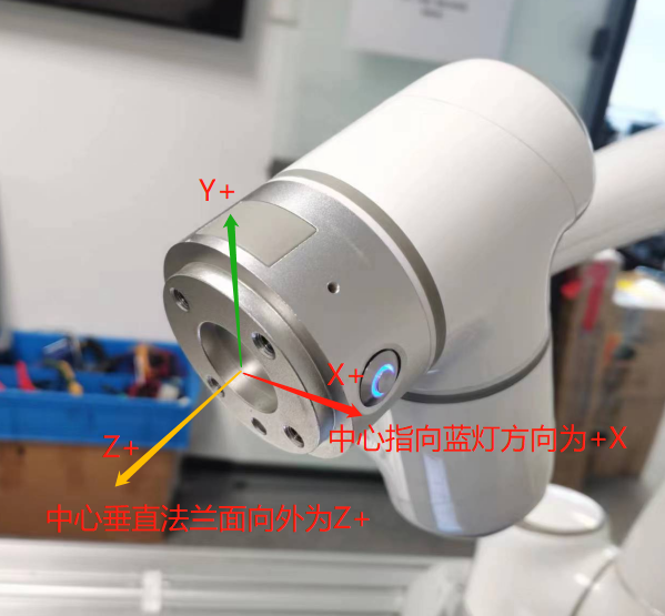 设置负载重心前首先我们先知道法兰盘中心点的位置及坐标系方向,EC系列法兰盘中心点如下图: