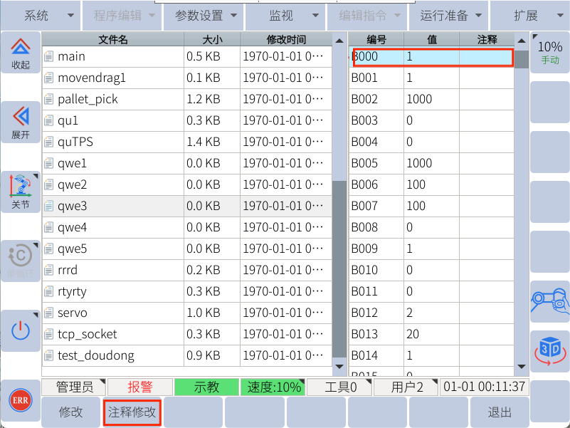 机器人在调试过程中经常会使用到全局变量和IO信号,在手动测试过程中为防止忘记变量和IO信号的功能,一般会在后面增加对应的注释,EC示教器上的全局变量(D,B,I,V,P)均可以人为修改注释(支持各类语言),数字IO,模拟量IO,M虚拟输入和输出也均支持修改注释