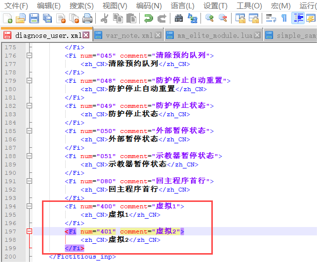 6)diagnose_user.xml文件打开后,根据需要可在文件下进行对应数字、虚拟、模拟量的输入输注释修改