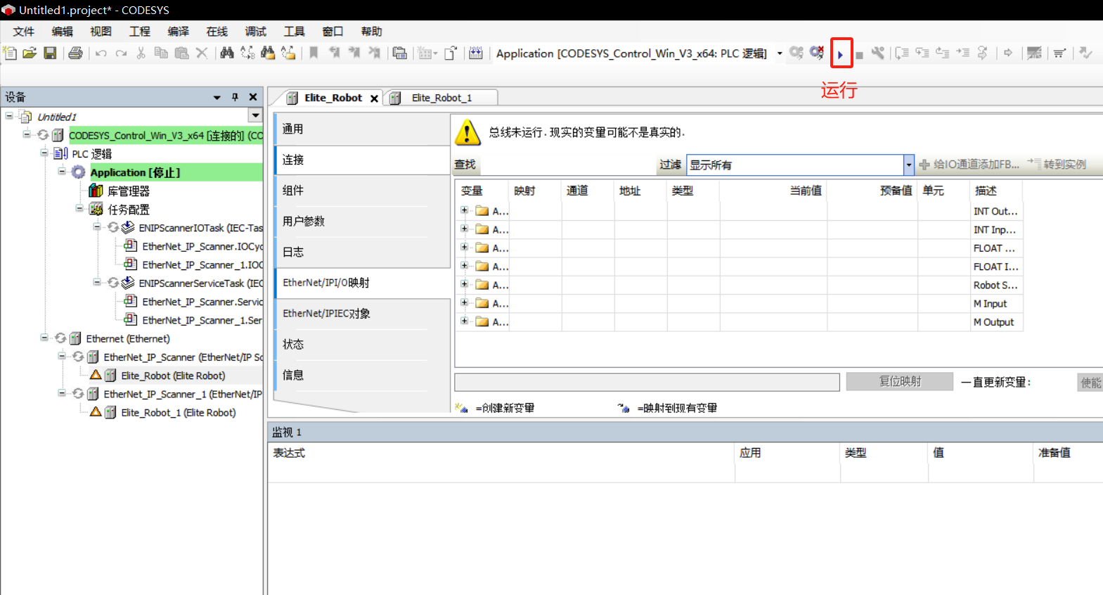 Adapter Slot 1: 32 个 32 位 int 输入寄存器,地 址范围 [0,31] 传输方向 O->T(codesys--elite)