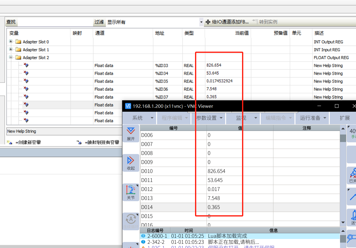 Float 输入,将 codesys 数值发送到机器人变量,D000-D004 关联到 Adapter Slot 3 输入前 5 个数值,数据变化一致