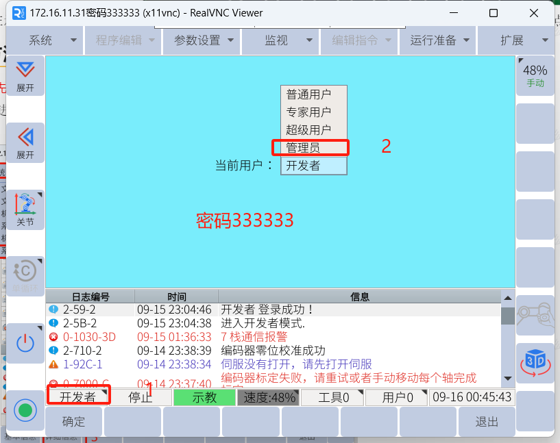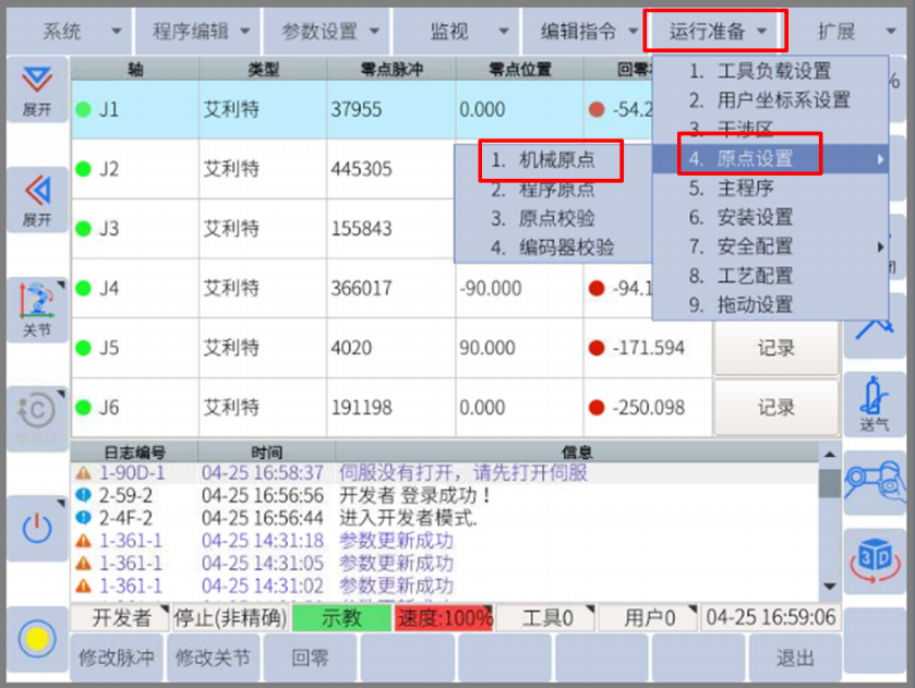 在示教器上,先切换成管理员模式,再点击:运行准备-原点设置-机械原点,可以进入机械零点界面。
