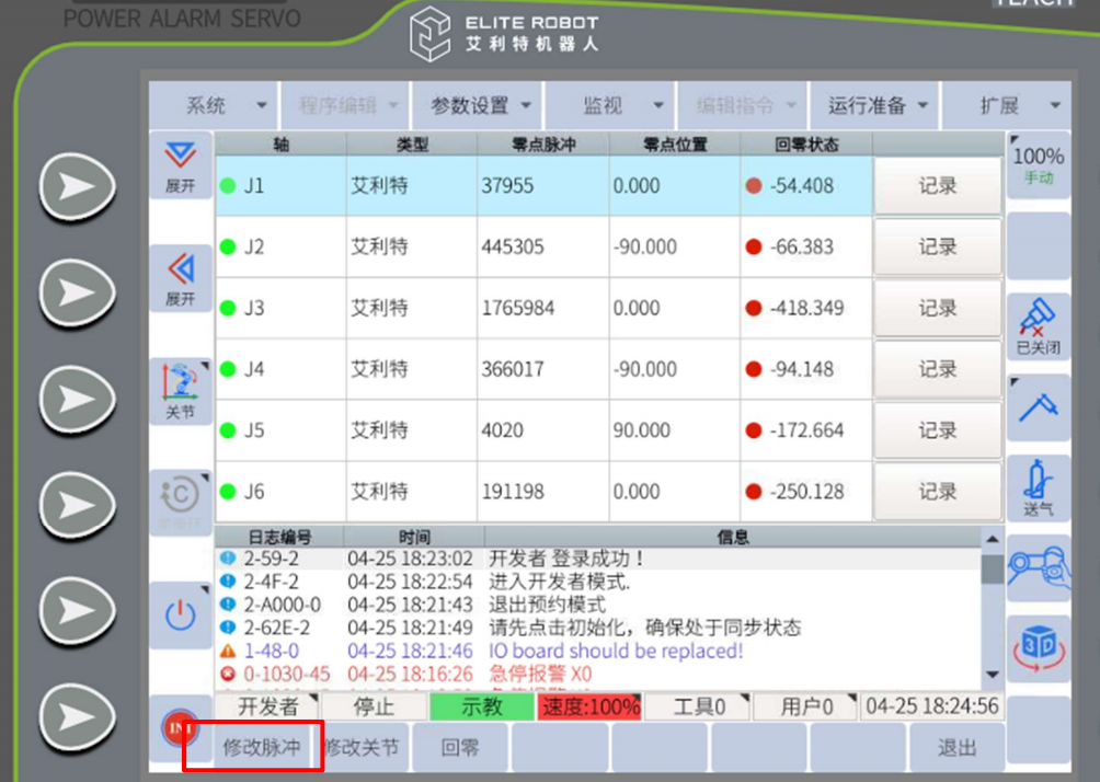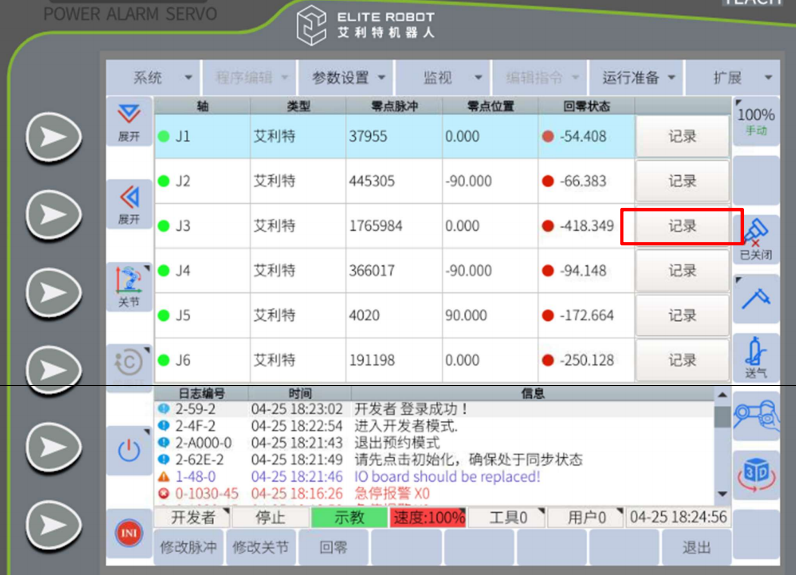 先用手机对零点界面拍照,把六个关节的零点脉冲都拍照记录下来。然后在示教器上对套圈超限关节点击:记录。这时该关节角度会变成零点位置的角度,且该关节的零点脉冲值会改变,机器人可以手动运行。