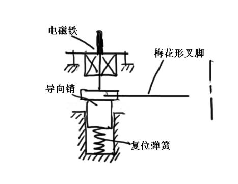 ● 梅花形叉脚与电机轴相连。在电磁铁未通电的状态下,导向销在复位弹簧的作用下弹起,其肩部刚好可以挡住梅花形叉脚。这时抱闸处于闭合状态。在电磁铁通电或手动按下状态下,导向销下沉其肩部低于梅花形叉脚。这时抱闸出于打开状态。