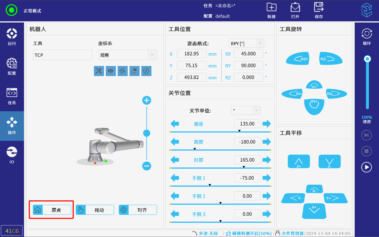 1、开机从打包位进入垂直位置,直接点击原点,就可以进入垂直姿态,不要直接按关节移动或者直线坐标系移动,由于520机器人有从动关节会出现机器人一直返回垂直姿态的情况