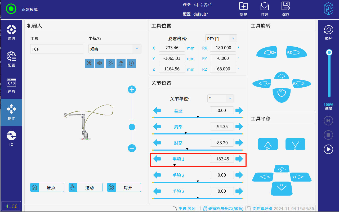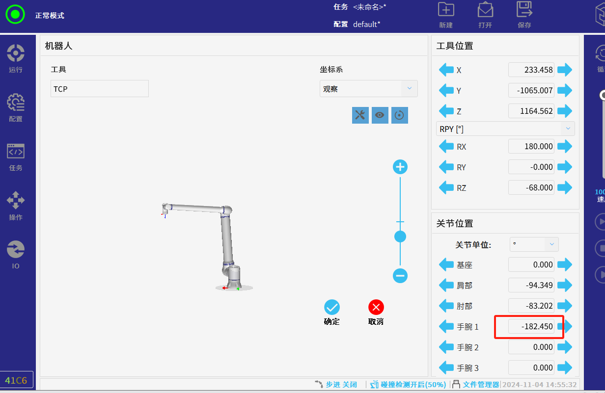 (2)进入机器人页面后点击关节位置手腕1,输入对应想移动的角度后,点击对号,长按自动移动就可以。