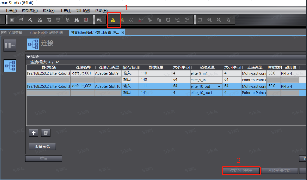 12、 全局变量设置完成后,点击上方栏工具选项,找到 EtherNet/IP 连接设置点击进入
