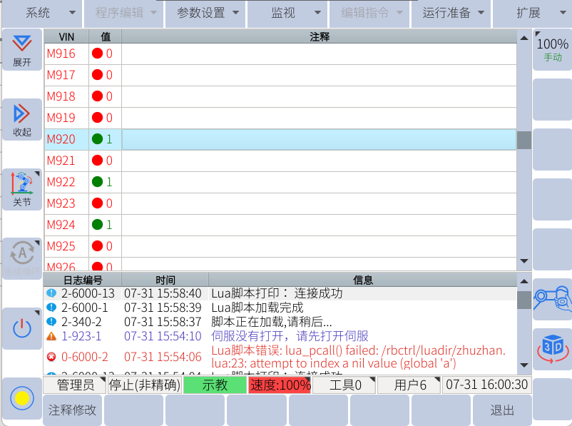 将机器人端485线接好,目前设置波特率为115200,将机器人脚本配置好,如下图所示