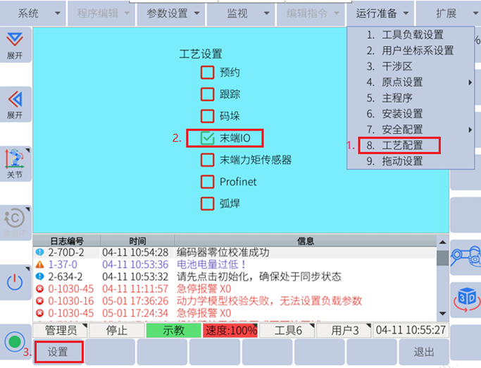 运行准备-工艺配置-勾选末端IO-设置,重启后生效(注意:不要勾选末端力矩传感器)。