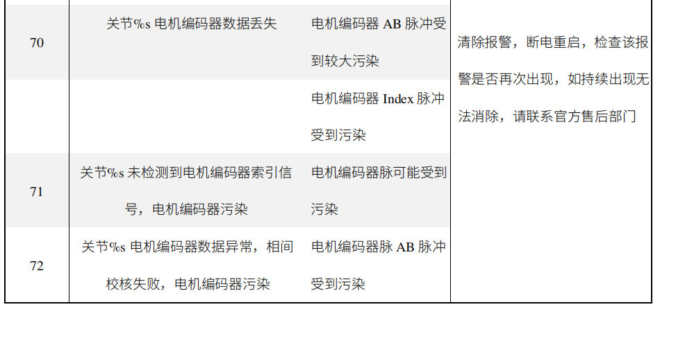 当机器人出现报警70,71,72,73当中的任意一个代码时,可以按照用户手册上的故障代码进行断电重启操作,若重启后任然报警则表示机器人光编可能出现了污染,可以对其进行屏蔽,如果屏蔽后出现其他报警代码或者点位不准的现象则需联系厂家进行返厂维修。