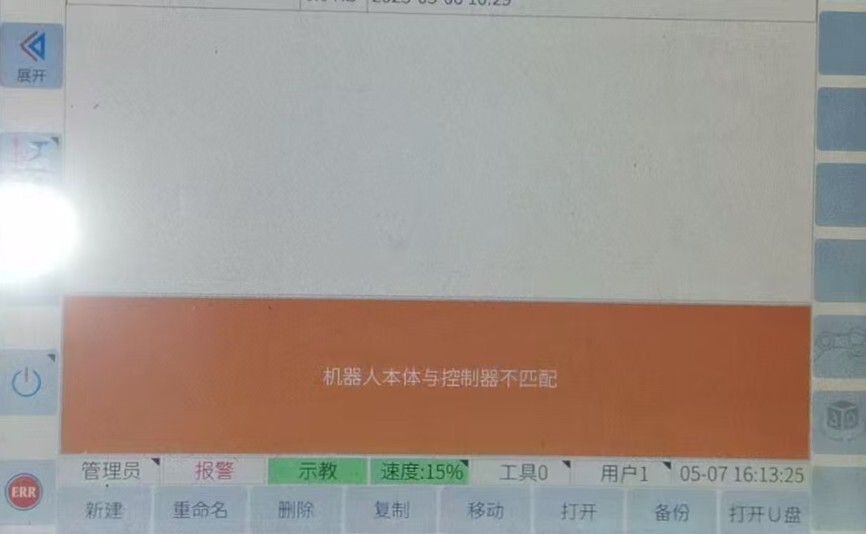 原因1:每台机械臂本体都有其对应的控制柜,如果机械臂与控制柜序列号不匹配的话,会导致报警控制器与机器人不匹配。