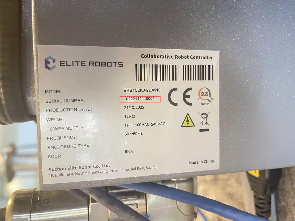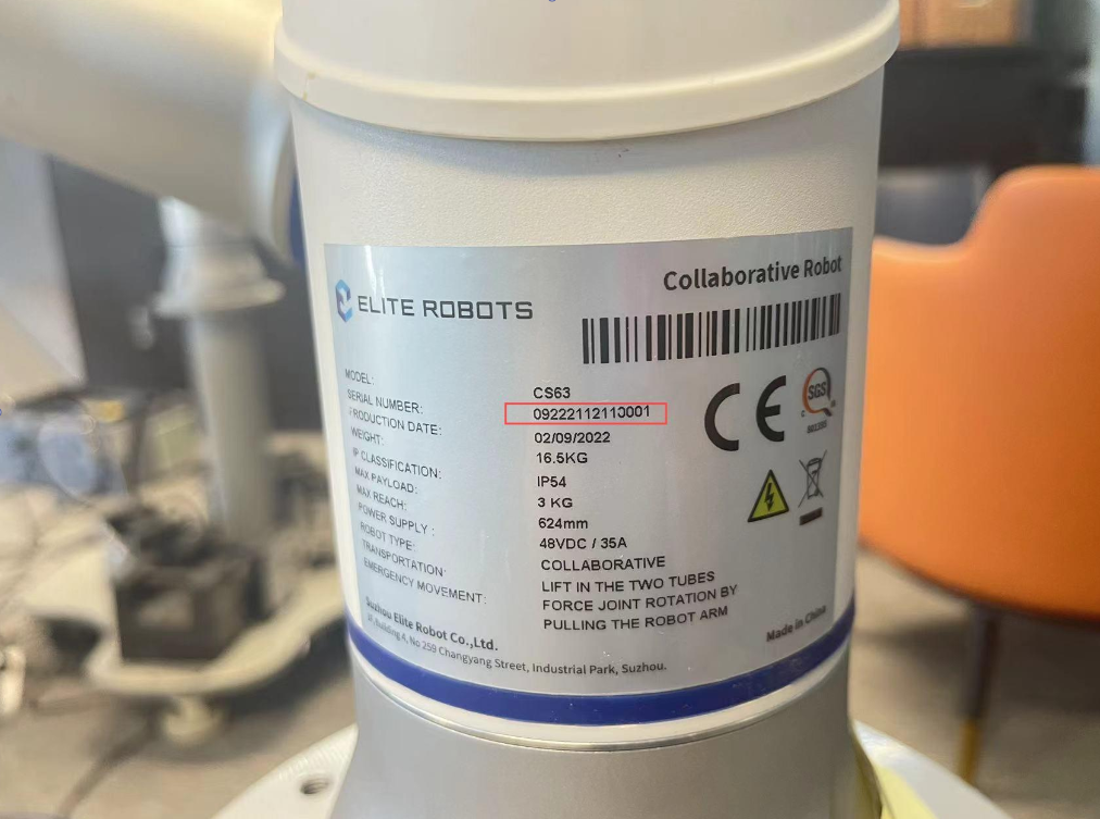 步骤1:首先确定机械臂本体的序列号和控制柜的序列号是否匹配,机械臂本体的序列号在1关节标签处,控制柜序列号在控制柜右侧标签处。如下图: