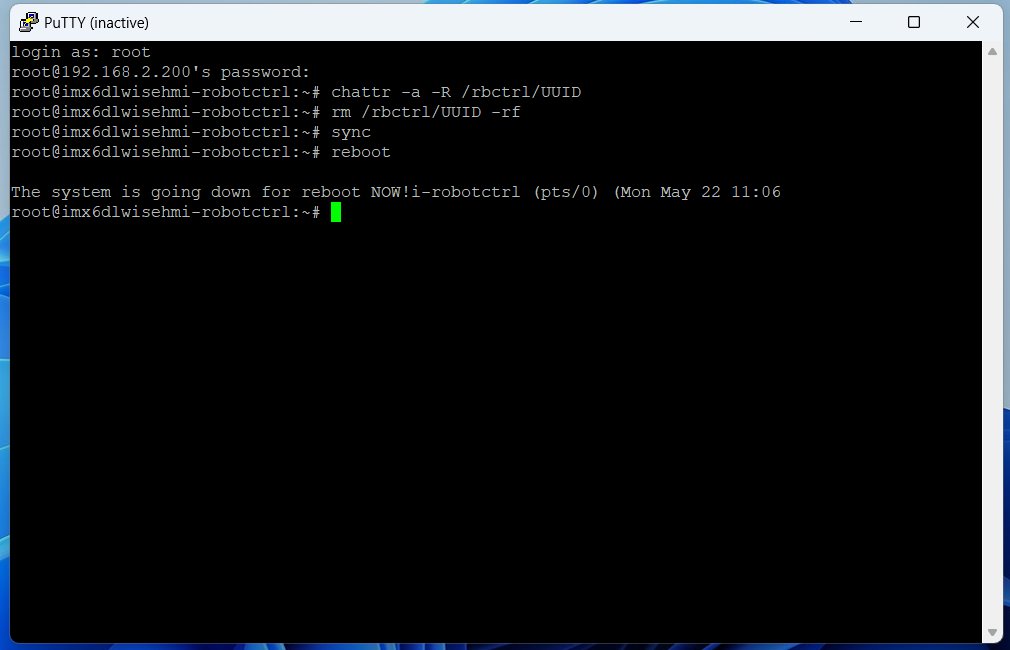 例:(root@imx6dlwisehmi-robotctrl:~# reboot)