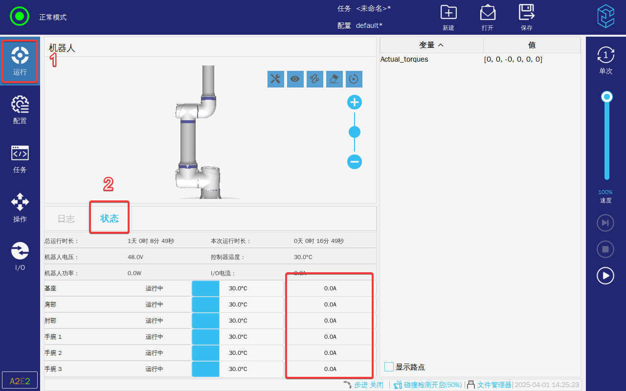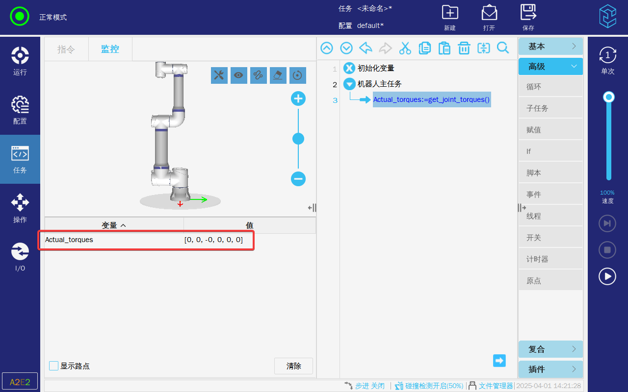 机器人示教器暂无当前关节力矩数值可视化,可通过关节电流,以及指令获取当前关节力矩;