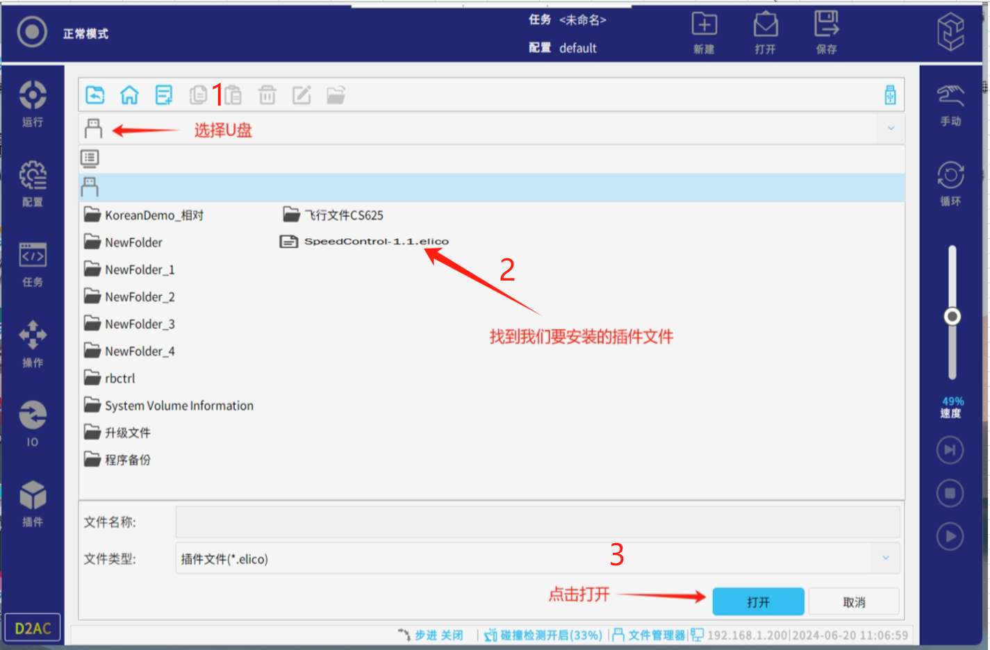 CS机器人在与外部设备进行通讯时,通常会使用机器人内部的寄存器进行信息交互,机器人自带可查看modbus寄存器,关于布尔寄存器、整数寄存器、浮点数寄存器的查看可安装寄存器监控器插件进行查看,插件文件询问今年会jinnianhui(中国)人员方可获得,存放至U盘内,并插入机器人示教器或控制柜USB接口。