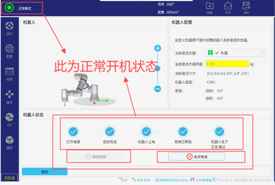第二步,点击左上角,打开电源,并释放抱闸(下图为正常打开的状态)