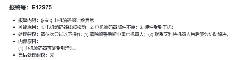 E12S75报警所指示的是:{joint} 关节编码器读取异常。其具体释义如下: