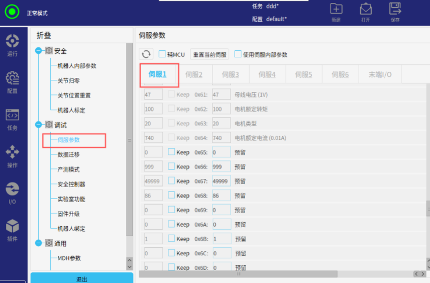 第四步:进入开发者模式,输入密码elibot后,选择伺服参数,选择对应关节伺服。(例如:伺服1故障,如下图。)