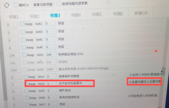 ●  找到对应的关节,屏蔽0x54=1(0:有霍尔,1:无霍尔),0X03修改为5保存。