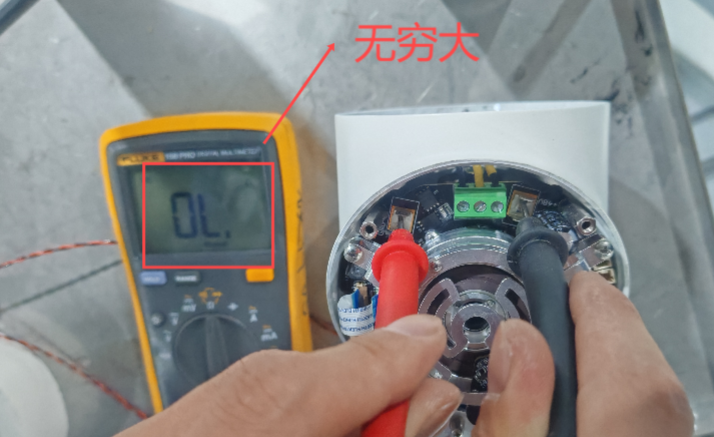 6.  使用万用表旋转至蜂鸣档,测量GND与电机线(或螺柱与电机线),看是否短路,查看阻值是否在千欧以上(千欧以上表示ok)(有蜂鸣声,GND与电机线导通,表示短路)下图为正常阻值: