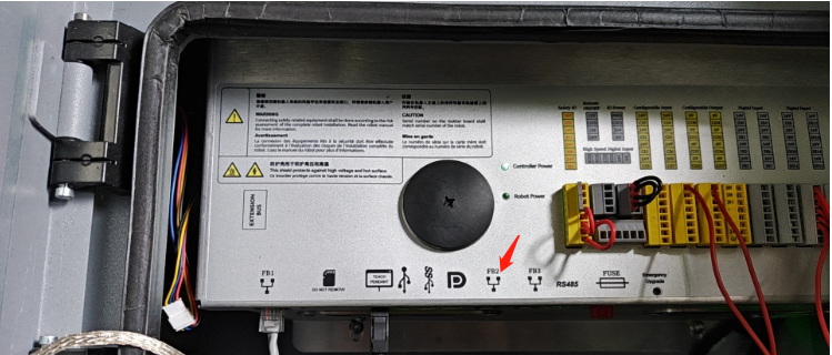 2.3 将网线连至控制柜的FB2网口(profinet Ethernet通讯走FB1网口,modbus/tcp通讯机器人做主站走FB2网口,做从站走FB1)