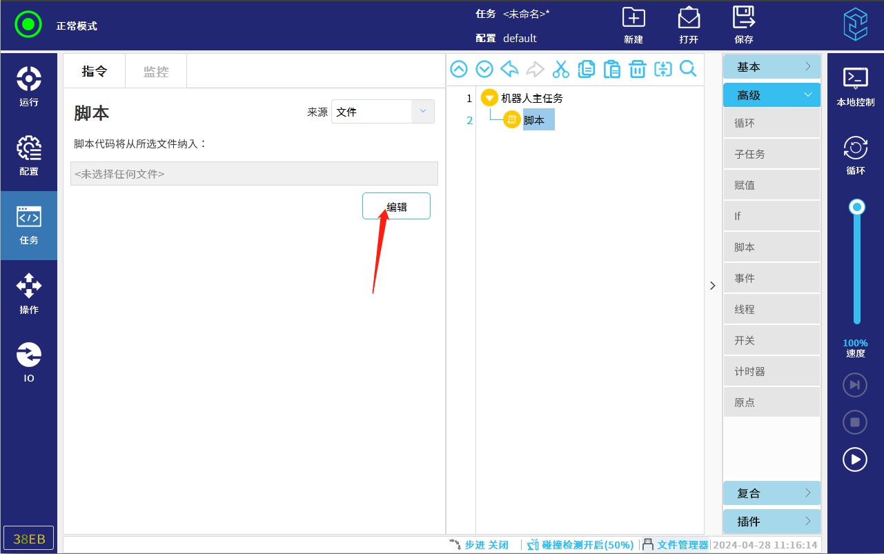 2.5 点击任务树下的脚本行,点击来源选项,选择文件后,点击编辑