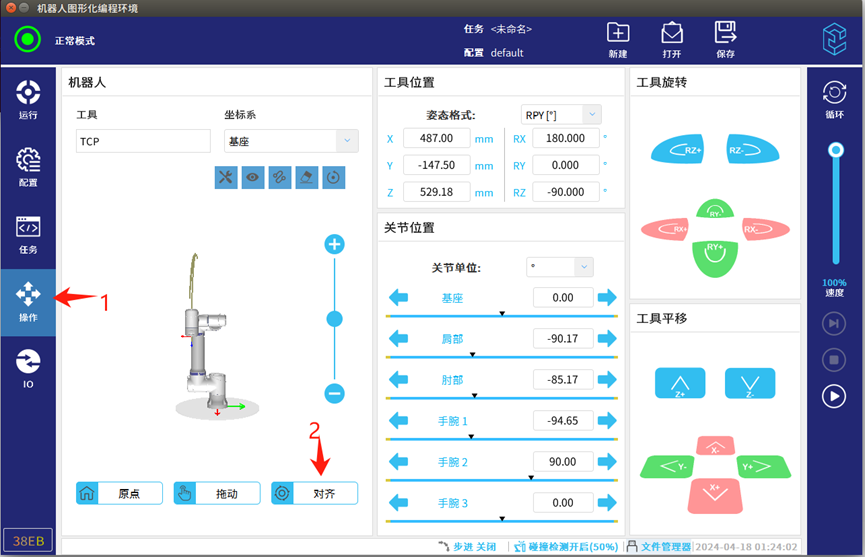 ● 自动对齐:使 TCP(工具坐标) 和当前选择坐标系(基坐标/用户坐标),在 XOY 平面保持平行。