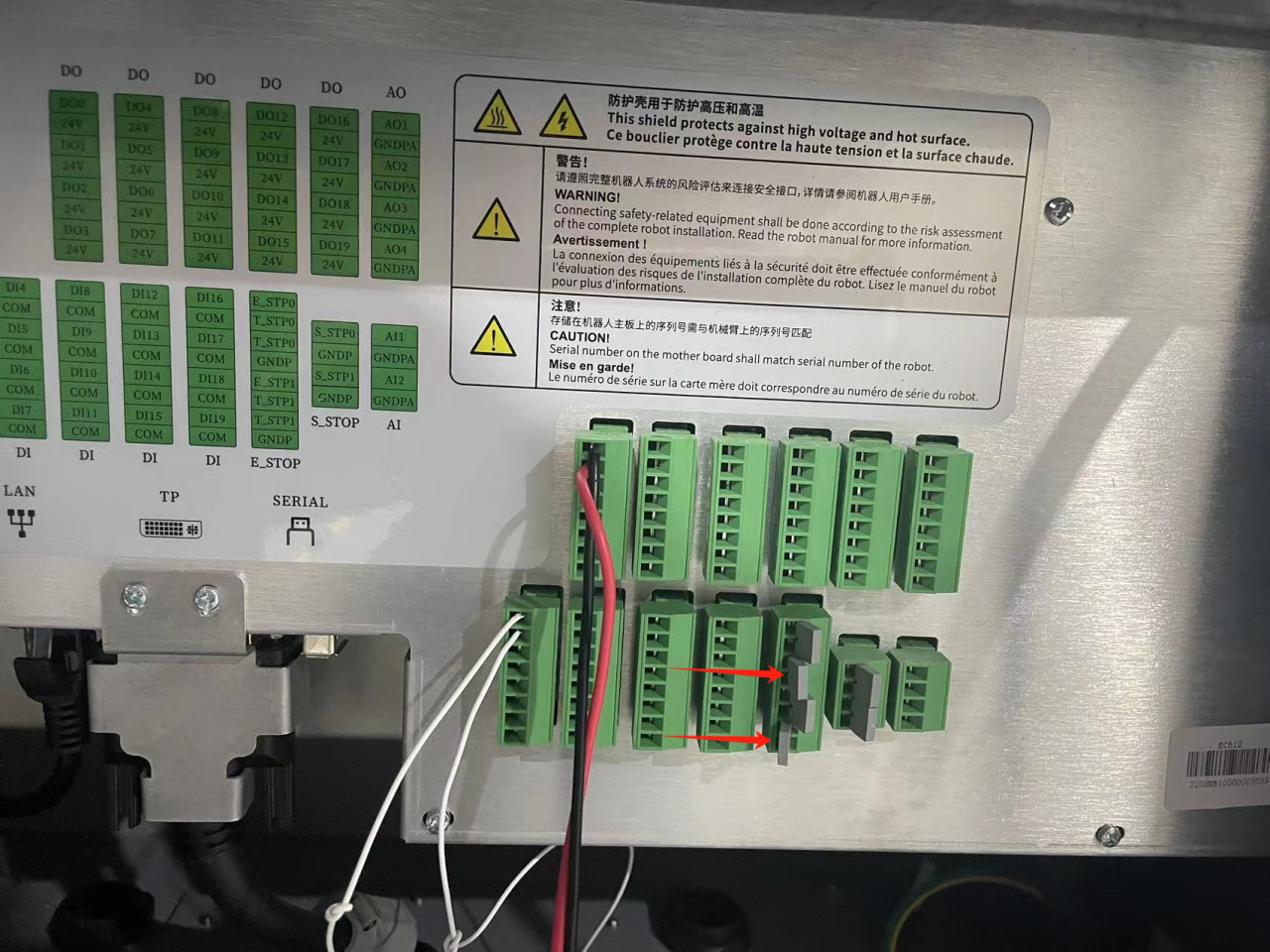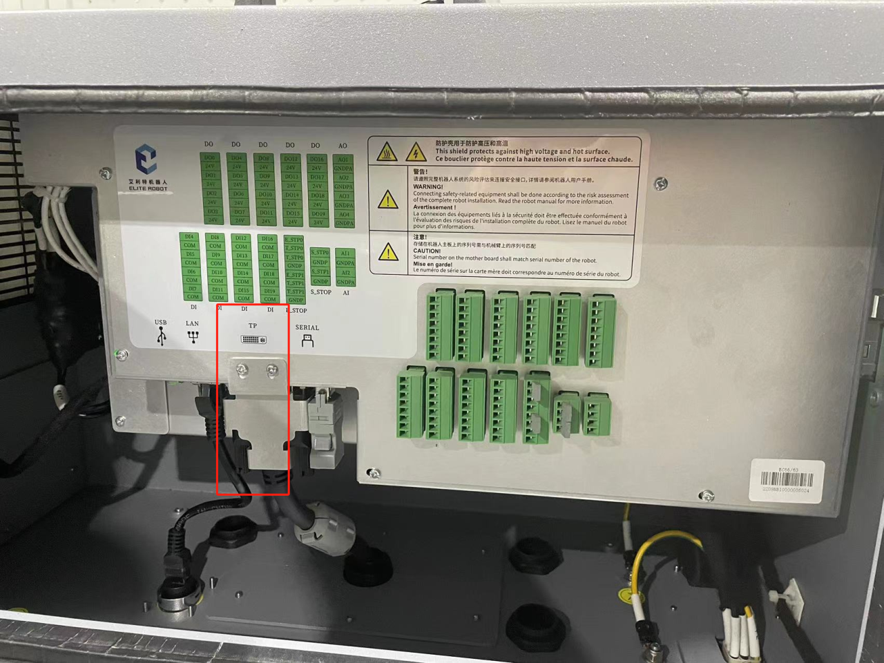 将控制器的TP端螺丝拆除,把掉示教器插头。如图3