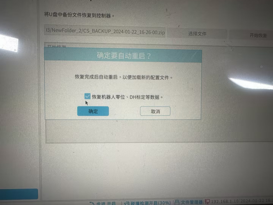 2.2.5.3按照图-18所示,勾选恢复机器人零位、DH标定等数据>确定,等待恢复备份 完成重启即可。